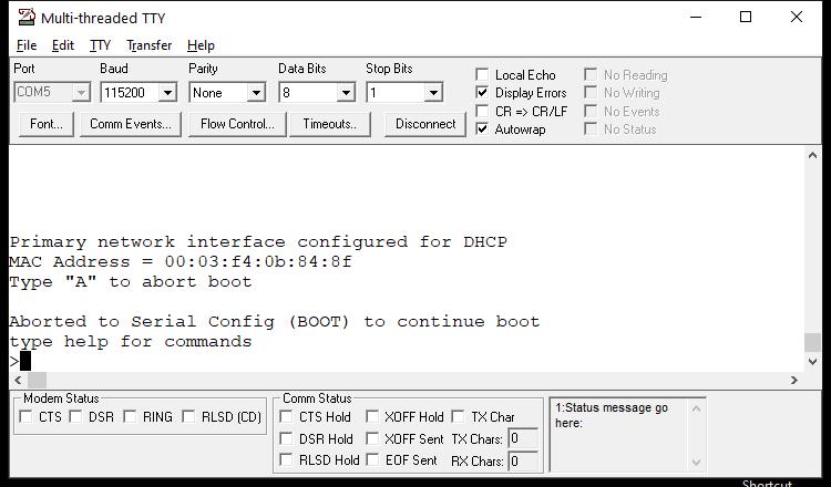 You are now in the serial configuration mode as indicated by the '>' character. Typing "help" will display the help menu.