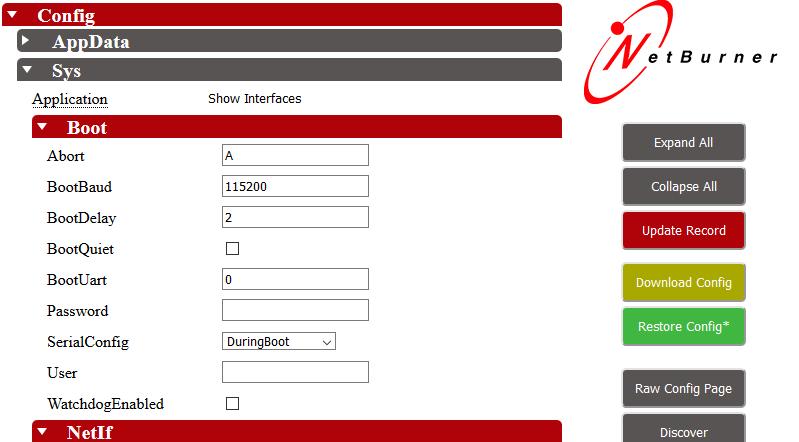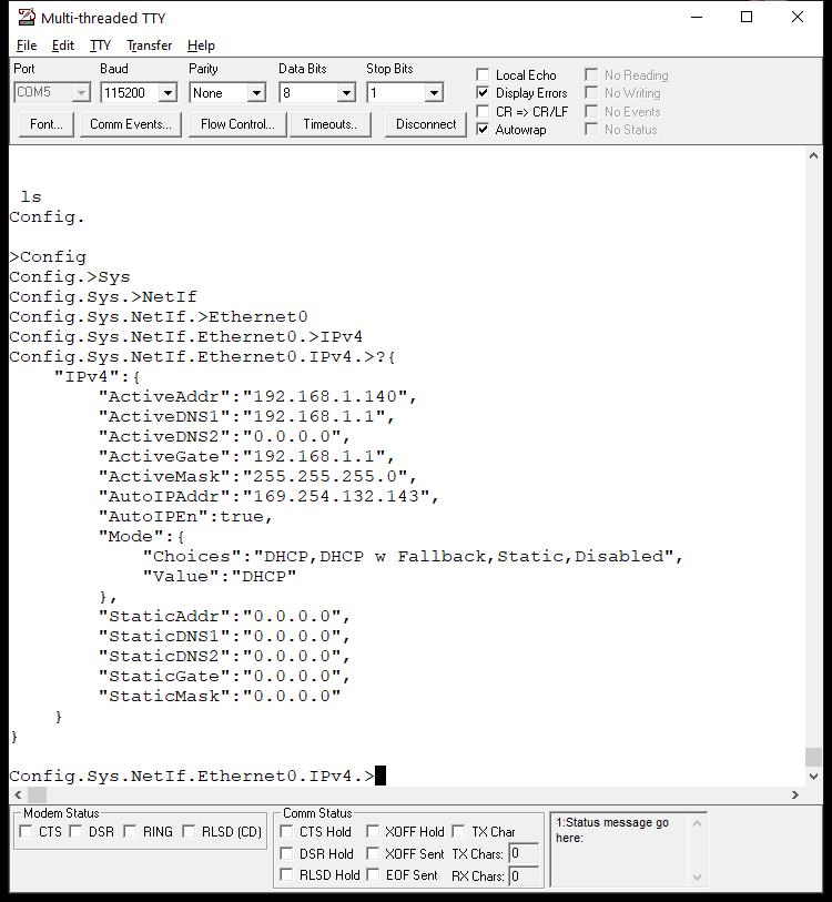 Network connectivity is not required to use your NetBurner device. If enabled, the Configuration Server can be accessed through the device's serial port. The configuration tree is exactly the same as what you see on the web interface and in the JSON object. For example, the Ethernet0 settings are located at Config > Sys > NetIf > Ethernet0