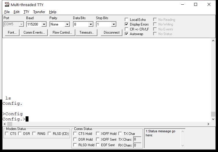 The device is now waiting to recive the application image file. Use your serial terminal option to send a binary file, and select the .bin file of the application you wish to send. After the file is uploaded, the device will reboot. In the display below the flash command is entered, the file is sent, and the status messages confirming the programming was complete. The device reboot informatoin of the new application begins with "Primary network interface....".