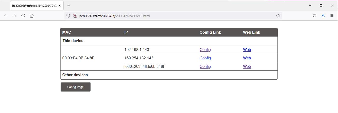The "Device" link will take you to the device application web page. The "ConfigPage" link will take you to the device configuration web page, as shown below: