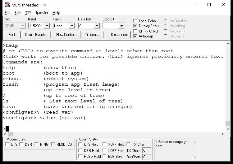 BootBaud | Boot serial port baud rate. Default is 115200, N, 8, 1. |