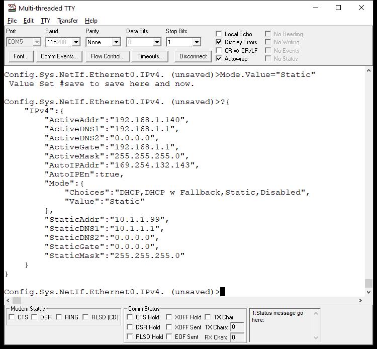 since we are at the root level. In this example we will set the Static IP values. Note that to change from DHCP to static, we must also change the Mode