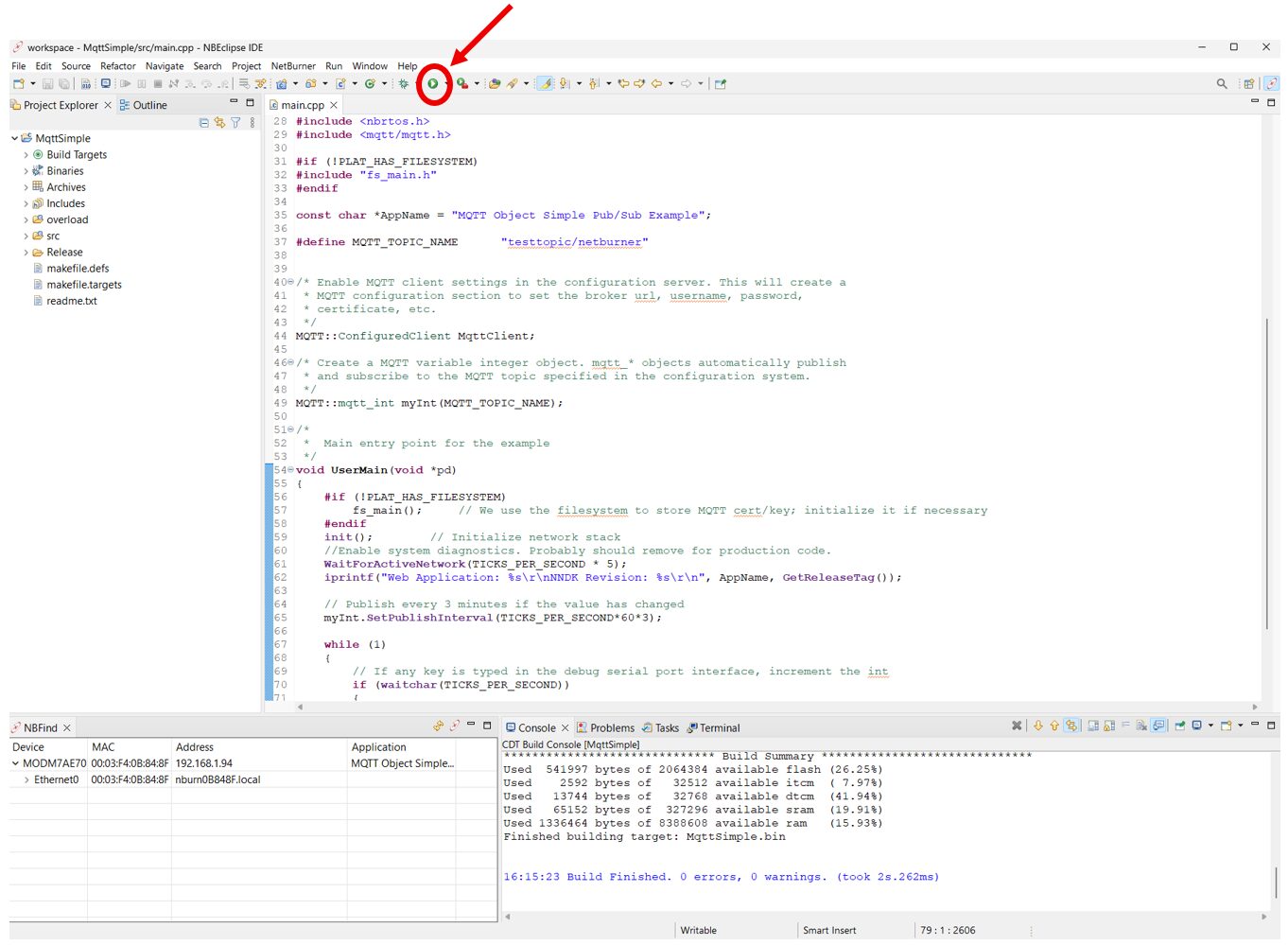 The project will automatically build. The IDE is shown below with main.cpp in the editor. The bottom left window shows the NetBurner device details, the bottom right window shows the build output. Clicking on the green Play button in the NBEclipse tool bar will download the application.