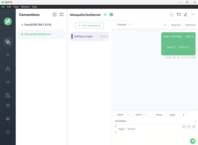 - We created a topic on the broker named “testtopic/mqttx”. MQTTX can both publish and subscribe to that topic.
