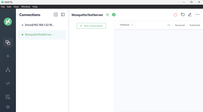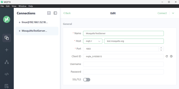 Running MQTTX, I created a new connection for test.mosquitto.org called MosquittoTestServer. It is running on port 1883 which is the default port for plain MQTT. The Client ID must be unique for every device. An easy way to do that is to use a prefix and the last few octets of the MAC address, like “nburn1234”. You can also see the Linux connection in the list, more on that later.