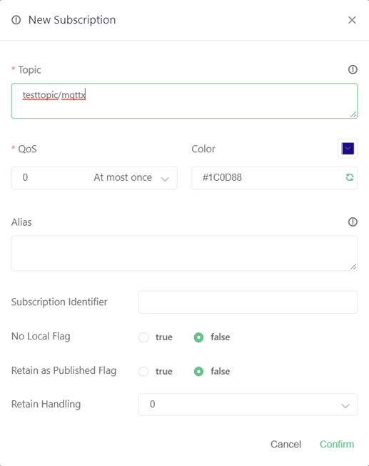 For my testing I picked a topic name of: testtopic/mqttx. That is all we need to do, so click on Confirm at the bottom of the page. QoS means quality of service (what level of guarantee MQTT will give your message’s delivery), you can leave that at the default for now.