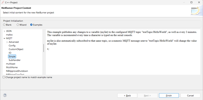 Select the Examples radio button. A list of all NetBurner examples will appear on the left. Select the MQTT Simple example