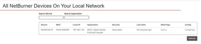 I can now open a web browser and go to discover.netburner.com from the same network as my device, and device’s details. Click on the ConfigPage link to get to the configuration web page. Note that if you know the device IP address, you can type it in the web browser with port 20034. For example, http://192.168.1.94:20034 .