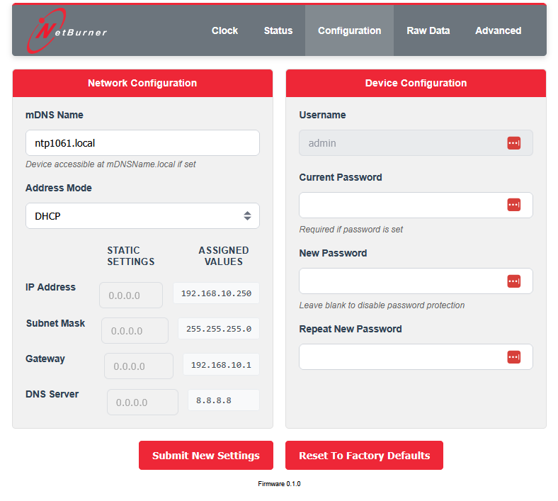 The first thing you’ll want to do is set a password on the Configuration page. On the Clock and Status pages you can see the current time and satellite status. We also suggest setting a Static IP or using a DHCP reservation so your NTP clients have a consistent place to get their time.